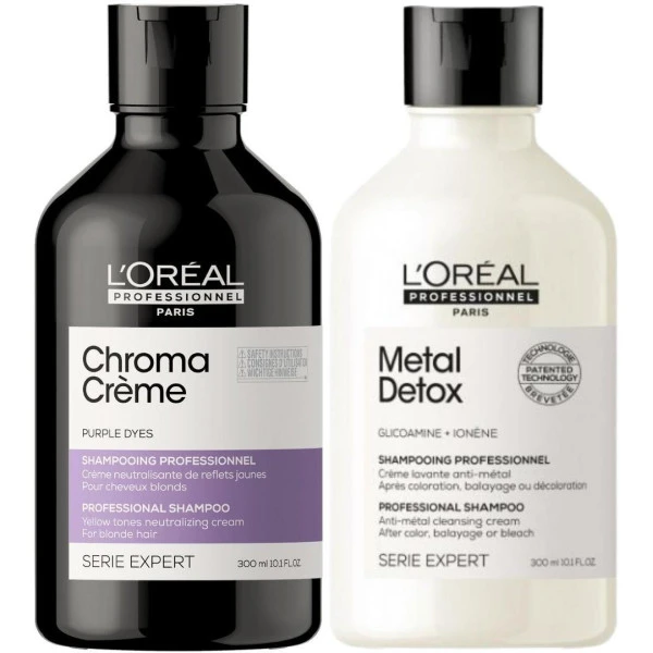 Duo Métal Detox + Shampooing violet Chroma Crème de L’Oréal Professionnel, pour neutraliser vos reflets jaunes indésirables et nourrir intensément vos cheveux, comme un pro.