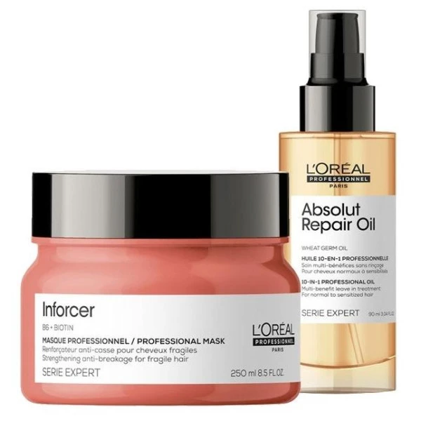 Duo Inforcer, spécial cheveux cassants, Série Expert de L’Oréal Professionnel pour que les cheveux cassants deviennent plus forts, plus brillants et plus souples.