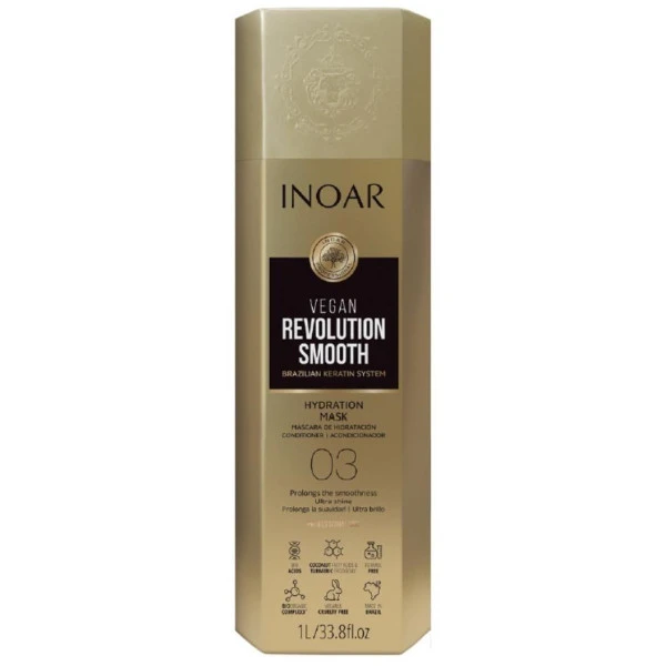 Le lissage Vegan Revolution Smooth d’Inoar avec sa formule exclusive et breveté. Sa composition est végan et Cruelty Free. Ces soins s’appliquent facilement et permettent de réaliser de multiples procédures comme le lissage, éliminer le volume, déninir les boucles, hydrater et reconstruire la fibre capillaire.