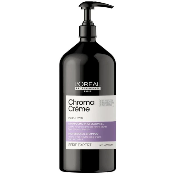 Shampooing violet Chroma Crème de L’Oréal Professionnel, pour neutraliser vos reflets jaunes indésirables et nourrir intensément vos cheveux, comme un pro.