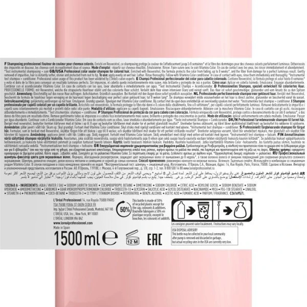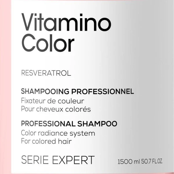 Conçu pour répondre aux besoins des cheveux colorés, le shampooing professionnel Vitamino Color Série Expert de L’Oréal Professionnel est formulé à base de Resveratrol, un fort polyphénol qui évite l’affadissement de la couleur et les dommages de la fibre capillaire suite à un service technique. Le Resveratrol garantie également une protection UV contre les rayons du soleil, souvent à l’origine de l’affadissement d’une coloration. La texture onctueuse et la mousse aérée du shampooing Vitamino Color feront de votre douche un réel moment détente.